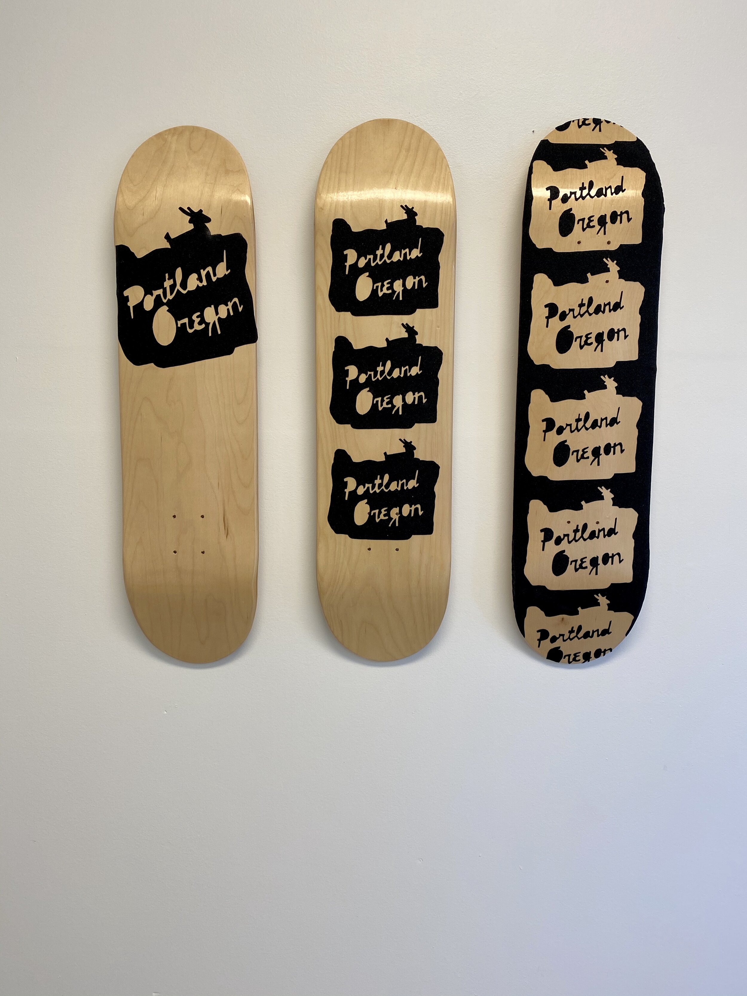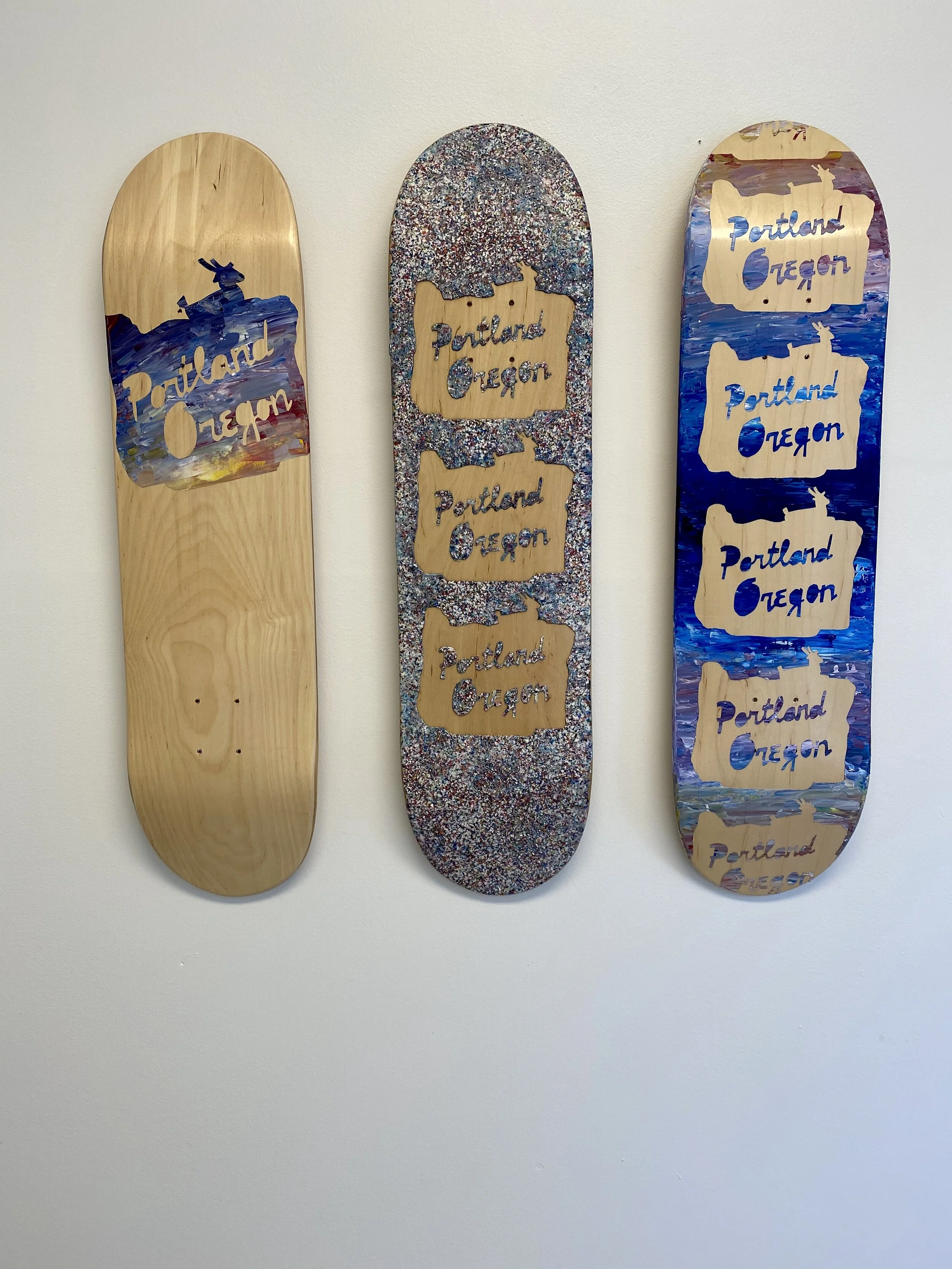 Additional pieces exploring the images of home across the Pacific Northwest on a canvas intended for transport and travel. Includes new mediums and techniques from prior skate deck series, including relief sculpture through waxed skateboards to create a cross section triptych.