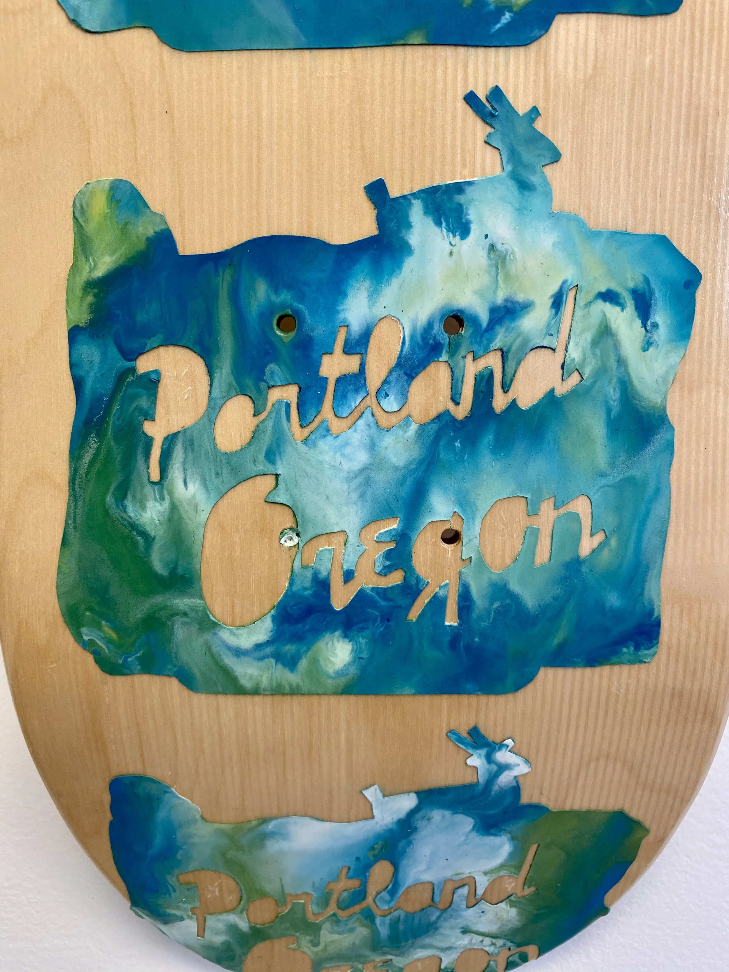 With life slowed down in 2020, I have prioritized creating and am grateful for the time and space to be able to make this most recent series. An expansion on a skateboard deck exploration done over five years ago, the Portland Skate series continue the theme of depicting home on a canvas meant for transportation.